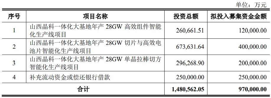 晶科能源向特定對(duì)象發(fā)行股票募集資金總額不超過970,000.00萬元(含本數(shù)),扣除相關(guān)發(fā)行費(fèi)用后的募集資金凈額,擬用于山西晶科一體化大基地年產(chǎn)28GW高效組件智能化生產(chǎn)線項(xiàng)目、山西晶科一體化大基地年產(chǎn)28GW切片與高效電池片智能化生產(chǎn)線項(xiàng)目、山西晶科一體化大基地年產(chǎn)28GW單晶拉棒切方智能化生產(chǎn)線項(xiàng)目、補(bǔ)充流動(dòng)資金或償還銀行借款。