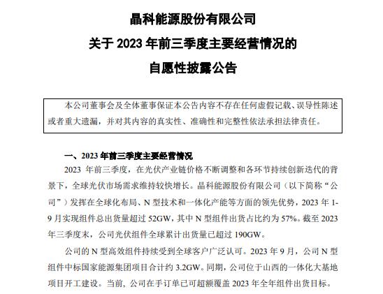 晶科能源公告稱(chēng),1-9月實(shí)現(xiàn)組件總出貨量超過(guò)52GW,其中N型組件出貨占比約為57%;截至2023年三季度末,公司光伏組件全球累計(jì)出貨量已超過(guò)190GW。