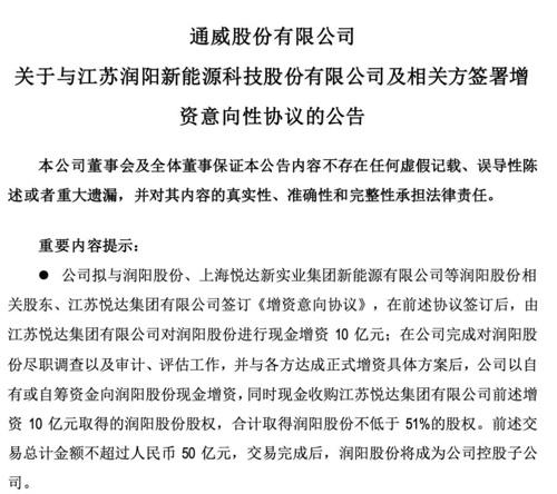 據(jù)公告顯示,在前述協(xié)議簽訂后,由江蘇悅達(dá)集團(tuán)有限公司對(duì)潤(rùn)陽股份進(jìn)行現(xiàn)金增資10億元;在通威股份完成對(duì)潤(rùn)陽股份盡職調(diào)查以及審計(jì)、評(píng)估工作,并與各方達(dá)成正式增資具體方案后,公司以自有或自籌資金向潤(rùn)陽股份現(xiàn)金增資,同時(shí)現(xiàn)金收購悅達(dá)集團(tuán)前述增資10億元取得的潤(rùn)陽股份股權(quán),合計(jì)取得潤(rùn)陽股份不低于51%的股權(quán)。