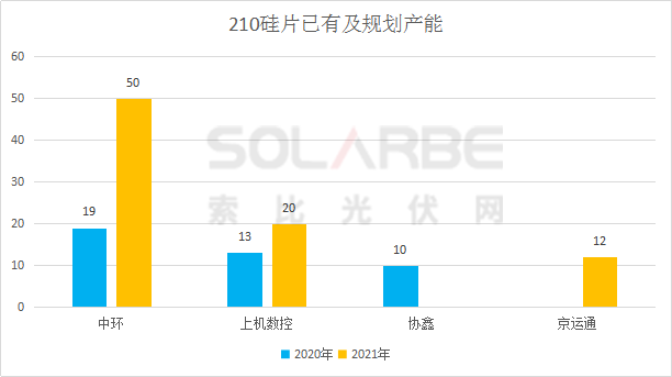 通過梳理現(xiàn)有以及規(guī)劃中的210產(chǎn)能,索比光伏網(wǎng)發(fā)現(xiàn),2020年底中環(huán)、上機數(shù)控、協(xié)鑫三家的210硅片產(chǎn)能已達42GW,2021年210硅片產(chǎn)能規(guī)劃已超92GW。由此看來,2021年210大尺寸硅片迭代速度將超乎預期。