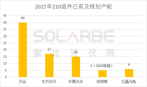 組件端,天合、東方日升、環(huán)晟光伏、阿特斯四家企業(yè)2021年的210組件產(chǎn)能規(guī)劃超83GW。天合在浙江義烏、宿遷、江蘇鹽城建設了三大210超級工廠,2020年底天合210組件產(chǎn)能已超22GW,2021年在全球產(chǎn)能將超過50GW,其中210產(chǎn)能占比超過80%,在40GW以上。