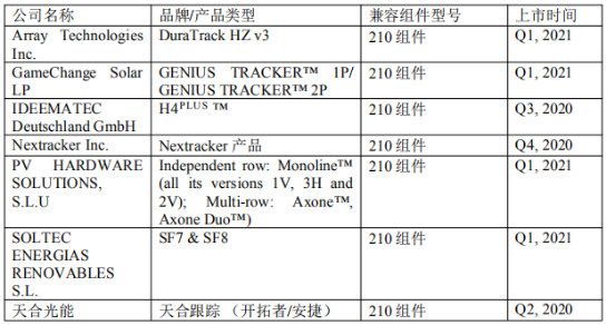 本次發(fā)布適配210組件的跟蹤支架品牌、適配產(chǎn)品及上市時間如下(按英文首字母排序):