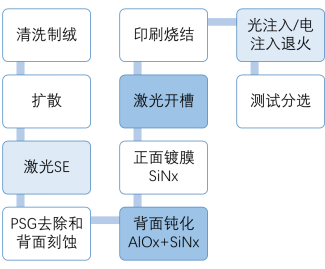 PERC電池的工藝流程相對簡單,且設(shè)備成熟,近兩年來,標(biāo)配了一些提效工藝,如激光SE、堿拋、光注入/電注入等,其整體工藝流程如圖3所示。