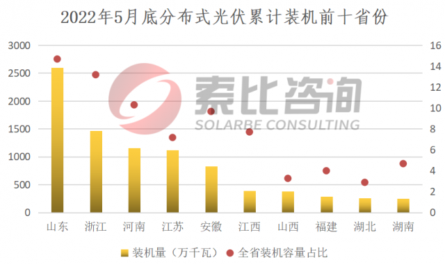 而分布式光伏方面,截至2022年5月底,累計裝機排名前三的省份分別是山東、浙江,江蘇,累計裝機分別為25.9GW、14.7GW、11.6GW。