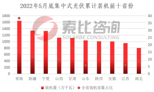 其中,集中式光伏方面,截至2022年5月底,累計裝機排名前三的省份分別是青海、新疆、寧夏,累計裝機分別為16.4GW、13.4GW、13.3GW。