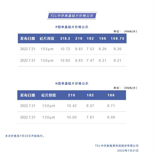 7月21日,TCL中環(huán)宣布,對P型、N型單晶硅片價(jià)格進(jìn)行調(diào)整。