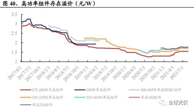 從最終組件端綜合成本來看,當(dāng)前 P-IBC 電池已經(jīng)具備成本優(yōu)勢,TOPcon 成本較 PERC 稍高,HJT 電池成本還需進(jìn)一步下降。溢價:TOPcon 高效組件產(chǎn)品溢價約為 0.1 元/W。新型產(chǎn)品性價比除了考慮 絕對成本優(yōu)勢外,還需考慮高功率溢價優(yōu)勢。參考PVinfolink數(shù)據(jù),2017-2020年 間,單晶組件相對于多晶組件長期保持 8%-10%的價格溢價,大尺寸(182及 210) 高功率組件產(chǎn)品相對于常規(guī)功率組件也能保持一定溢價。