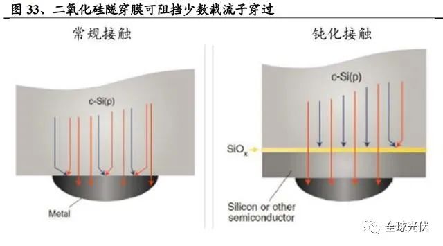 二氧化硅+摻雜多晶硅:隧穿作用和鈍化作用。二氧化硅隧穿膜最佳厚度在 1.2nm,其作用在于使多數(shù)載流子(電子)通過隧穿效應(yīng)穿過氧化層,但少數(shù)載流 子(空穴)被阻擋,從而進(jìn)一步降低了載流子復(fù)合效應(yīng)。摻雜多晶硅層一方面起到保護(hù)二氧化硅層的作用,另一方面會增加電子或空穴在氧化硅中的隧穿概率, 因此,多晶硅層的摻雜濃度越高,太陽能電池的開路電壓和效率就越高。