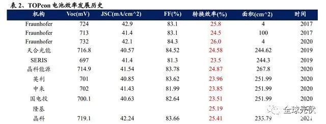 發(fā)展歷史:2013 年德國 Fraunhofer 研究所在 N 型 PERT 結(jié)構(gòu)基礎(chǔ)上,首次提 出 TOPCon 結(jié)構(gòu);2017 年 Fraunhofer 研究所在實驗室 TOPcon 電池上取得 25.8% 的效率記錄;2019 年,天合光能在面積為 244.62 平方厘米的 n 型襯底上制備出 正面最高效率為 24.58%的實驗室電池,并獲德國哈梅林太陽能研究所(ISFH) 下屬的檢測實驗室認(rèn)證,同年,天合光能 i-TOPCon 雙面電池大規(guī)模量產(chǎn)正面平 均轉(zhuǎn)換效率突破 23%。2021 年,晶科能源 TOPcon 電池在權(quán)威第三方測試認(rèn)證機 構(gòu)日本 JET 檢測實驗室標(biāo)定全面積電池最高轉(zhuǎn)化效率達(dá)到 25.4%,成為商業(yè)化全 面積電池效率記錄的保持者,為后續(xù)的 N 型 TOPCon 電池的擴(kuò)產(chǎn)奠定基礎(chǔ)。