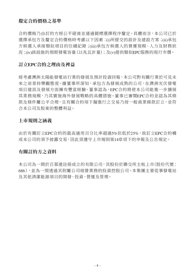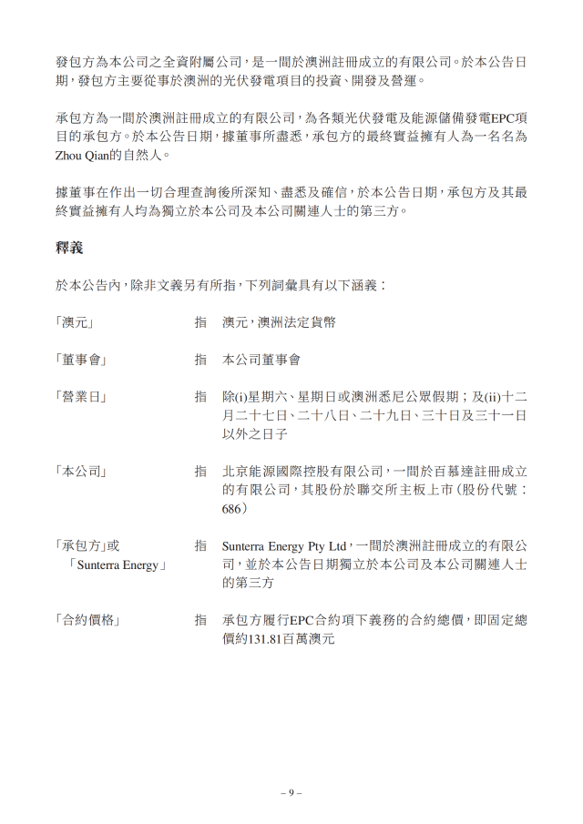 北京能源國際在公告中表示,經(jīng)考慮澳洲太陽能發(fā)電站行業(yè)的發(fā)展及預(yù)計(jì)投資回報(bào),公司對(duì)有關(guān)行業(yè)于可見未來的前景持樂觀態(tài)度。據(jù)董事所深知,承包方為發(fā)展成熟的公司,在澳洲光伏發(fā)電項(xiàng)目建設(shè)及發(fā)展方面擁有豐富經(jīng)驗(yàn)。董事認(rèn)為,EPC合約將使公司能進(jìn)一步擴(kuò)展其業(yè)務(wù)規(guī)模,乃其實(shí)施海外發(fā)展戰(zhàn)略的具體措施。董事已審閱EPC合約并認(rèn)為其條款及條件屬公平合理,且有關(guān)合約項(xiàng)下擬進(jìn)行的交易乃按一般商業(yè)條款訂立,并符合公司及股東的整體利益。