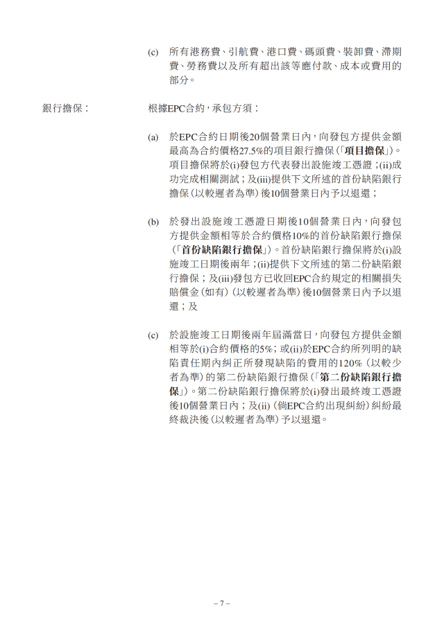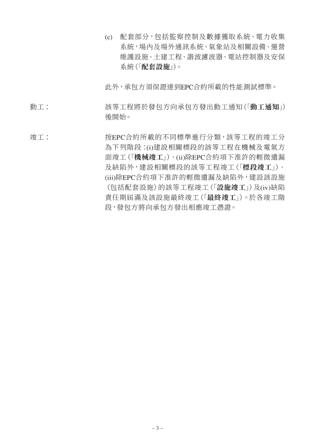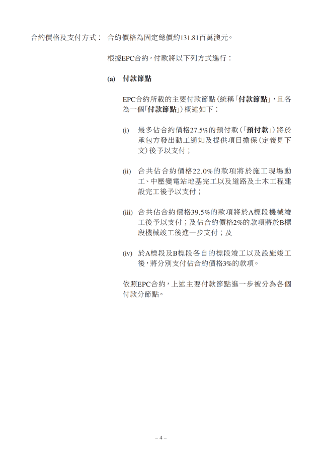 此EPC合約的合約價(jià)格約為1.32億澳元,當(dāng)前匯率折算約合6.17億元人民幣,設(shè)施為EPC合約項(xiàng)下的173.1兆瓦太陽能發(fā)電站內(nèi)設(shè)施的設(shè)計(jì)、工程、采購、供應(yīng)、建設(shè)、安裝、測(cè)試、委托及移交進(jìn)行的全部工程及服務(wù)。