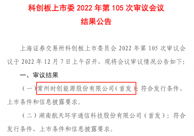 12月7日,上海證券交易所科創(chuàng)板上市委員會發(fā)布公告稱,常州時創(chuàng)能源股份有限公司首次公開發(fā)行股票申請符合發(fā)行條件、上市條件和信息披露要求。