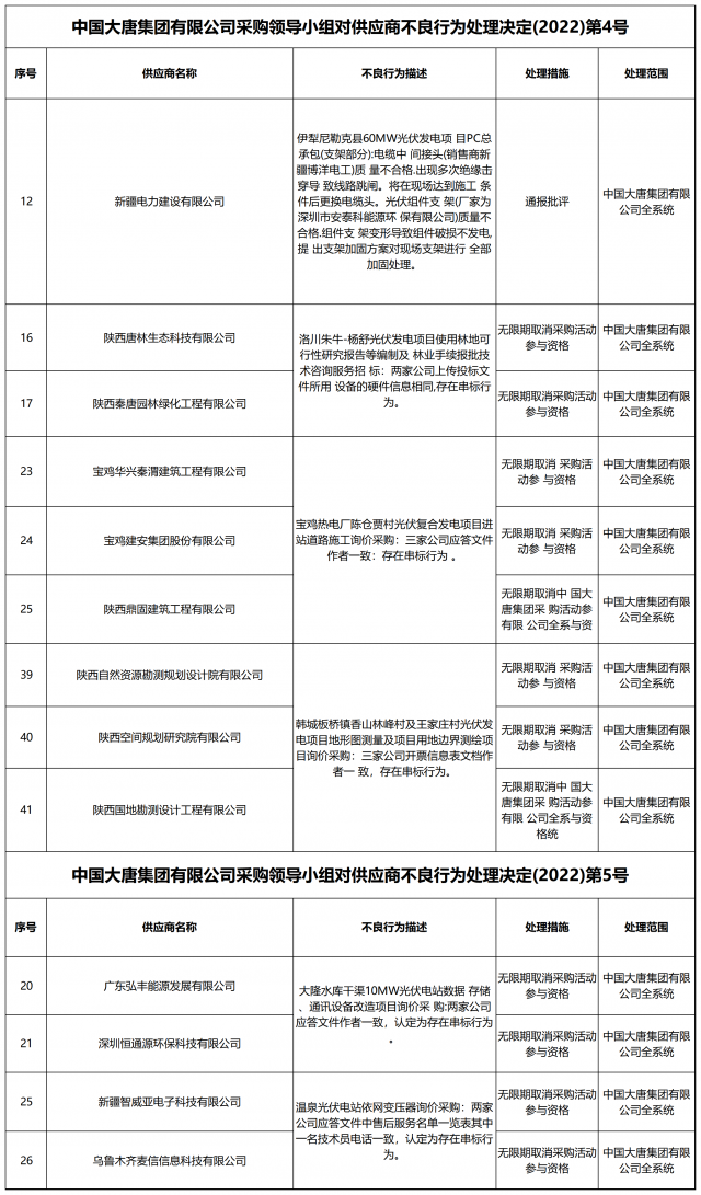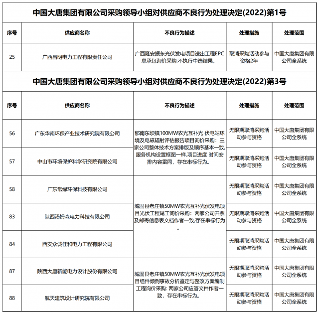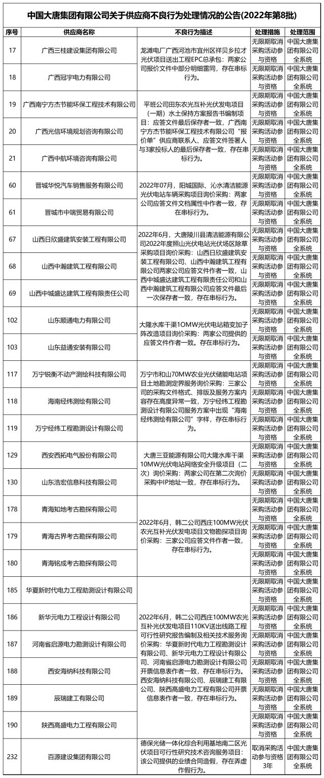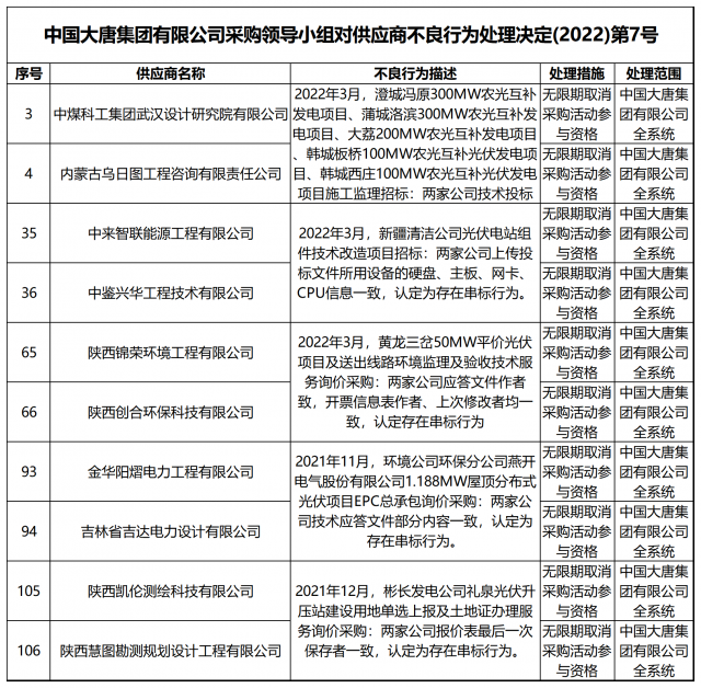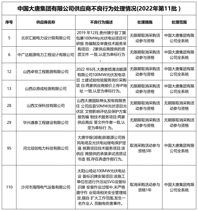 12月13日,中國大唐集團有限公司關于供應商不良行為處理情況的公告 (2022年第12批)公示,對出現不誠信行為、履約不力以及產品質量等問題的供應商進行了處理。本批次大唐集團共公布受處罰企業(yè)137家,其中,光伏相關企業(yè)共6家。
