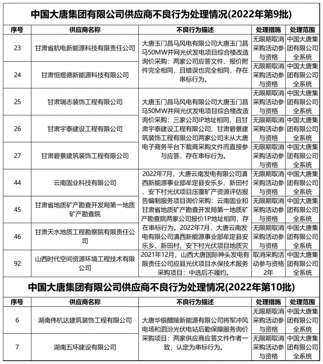 中國大唐集團有限公司關于供應商不良行為處理情況的公告(2022年第12批)