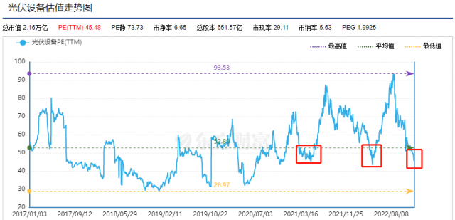 自8月18日高點(diǎn)以來,光伏板塊已經(jīng)連續(xù)4個(gè)月下跌,中證光伏產(chǎn)業(yè)指數(shù)(CSI:931151)最高跌幅達(dá)到27.91%。截至12月15日收盤,光伏板塊的滾動(dòng)市盈率均值為45.48倍,已經(jīng)低于今年4月27日48.75倍的估值水平(數(shù)據(jù)來源:Choice)。