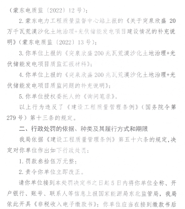 日前,東北能源監(jiān)管局向突泉欣盛太陽能發(fā)電有限公司開出一張罰單,經調查核實,你單位投資建設的突泉欣盛200兆瓦荒漠沙化土地治理+光伏儲能發(fā)電項目未按照國家有關規(guī)定辦理工程質量監(jiān)督手續(xù)。