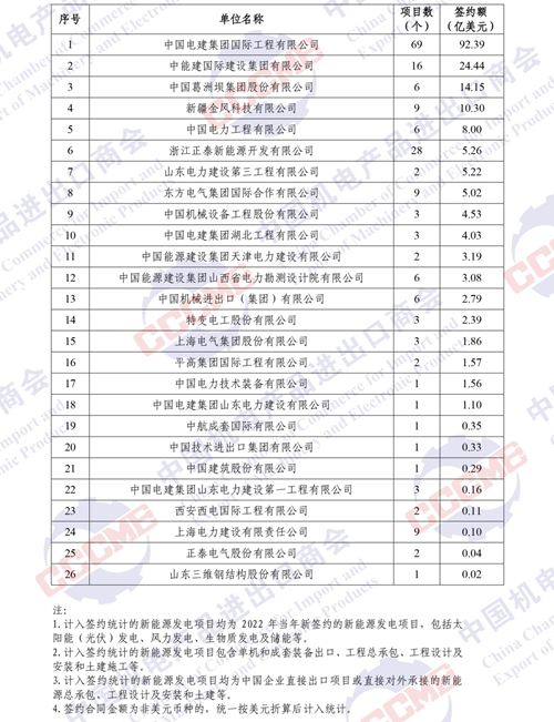 日前,中國機(jī)電產(chǎn)品進(jìn)出口商會(huì)發(fā)布2022年境外電力項(xiàng)目簽約排行榜。根據(jù)中國機(jī)電商會(huì)統(tǒng)計(jì),2022年,中國企業(yè)參與境外電力項(xiàng)目投(議)標(biāo)并最終實(shí)現(xiàn)簽約的項(xiàng)目517個(gè),簽約合同總金額339.93億美元,總裝機(jī)容量約33.5GW。根據(jù)各重點(diǎn)企業(yè)報(bào)送的2022年境外電力項(xiàng)目的新簽約情況,中國機(jī)電商會(huì)對(duì)企業(yè)簽約額進(jìn)行了排名。現(xiàn)將企業(yè)排名及火電、水電、輸變電、新能源(太陽能、風(fēng)、生物質(zhì)、儲(chǔ)能等)及太陽能(光伏)、風(fēng)電行業(yè)簽約排名予以發(fā)布。