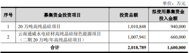 根據(jù)該方案,本次募資資金將用于兩大投資項目:一是20萬噸高純晶硅項目,擬投入募資額94億元(總投資將達101.0848億元);二是云南通威水電硅材高純晶硅綠色能源項目(二期20萬噸/年高純晶硅項目),擬投入募資額66億元(總投資將達100.7941億元)。