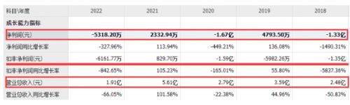 可以看到,在近五年里,該公司扣非凈利潤(rùn)除2021年稍有盈余以外,基本年份都處于虧損狀態(tài),而2021年?duì)I收也達(dá)到近5年新高。然而到2022年又迅速大跌至1.91億元的同期低谷。業(yè)績(jī)“坐過(guò)山車”也讓該公司備受資本市場(chǎng)的質(zhì)疑。
