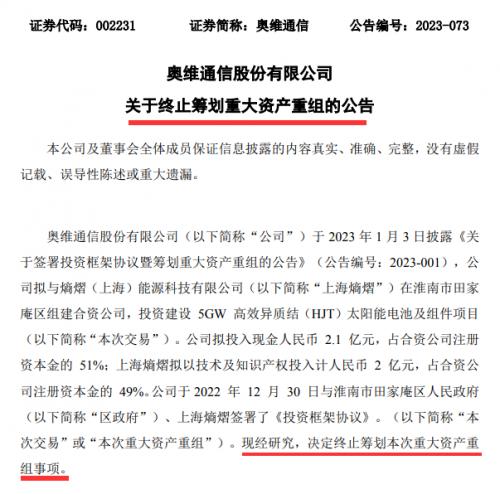 查閱此前公告可知,早在今年伊始,奧維通信曾于1月3日披露《關(guān)于簽署投資框架協(xié)議暨籌劃重大資產(chǎn)重組的公告》,擬與上海熵熠組建合資公司投建5GW高效異質(zhì)結(jié)太陽(yáng)能電池及組件項(xiàng)目。