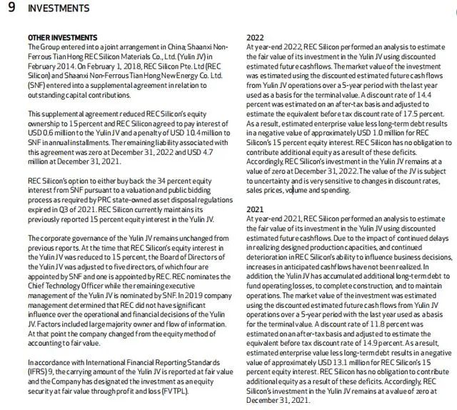 而REC硅披露了其參與公司運(yùn)營情況。根據(jù)年報,REC硅通過分析估算得出,天宏瑞科的企業(yè)價值減去長期債務(wù)后,REC硅所持15%的股權(quán)價值在2021年約為負(fù)1310萬美元,2022年則為負(fù)100萬美元,REC稱自己沒有必要再為此赤字進(jìn)行額外股本投資。