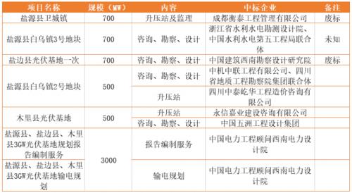 自去年以來,該企業(yè)就鹽源縣、鹽邊縣、木里縣3GW光伏基地項目先后發(fā)起了近10個光伏基地項目招標,包括3GW光伏基地規(guī)劃、輸電規(guī)劃、單獨項目的升壓站以及項目基地的咨詢、勘察、設計等。從公開的投標記錄可以看到,參與投標的企業(yè)不乏國內(nèi)知名電力設計院以及地方設計院系。但在眾多企業(yè)參與投標的同時,部分項目則由于中標企業(yè)未簽署相關合同變?yōu)閺U標。