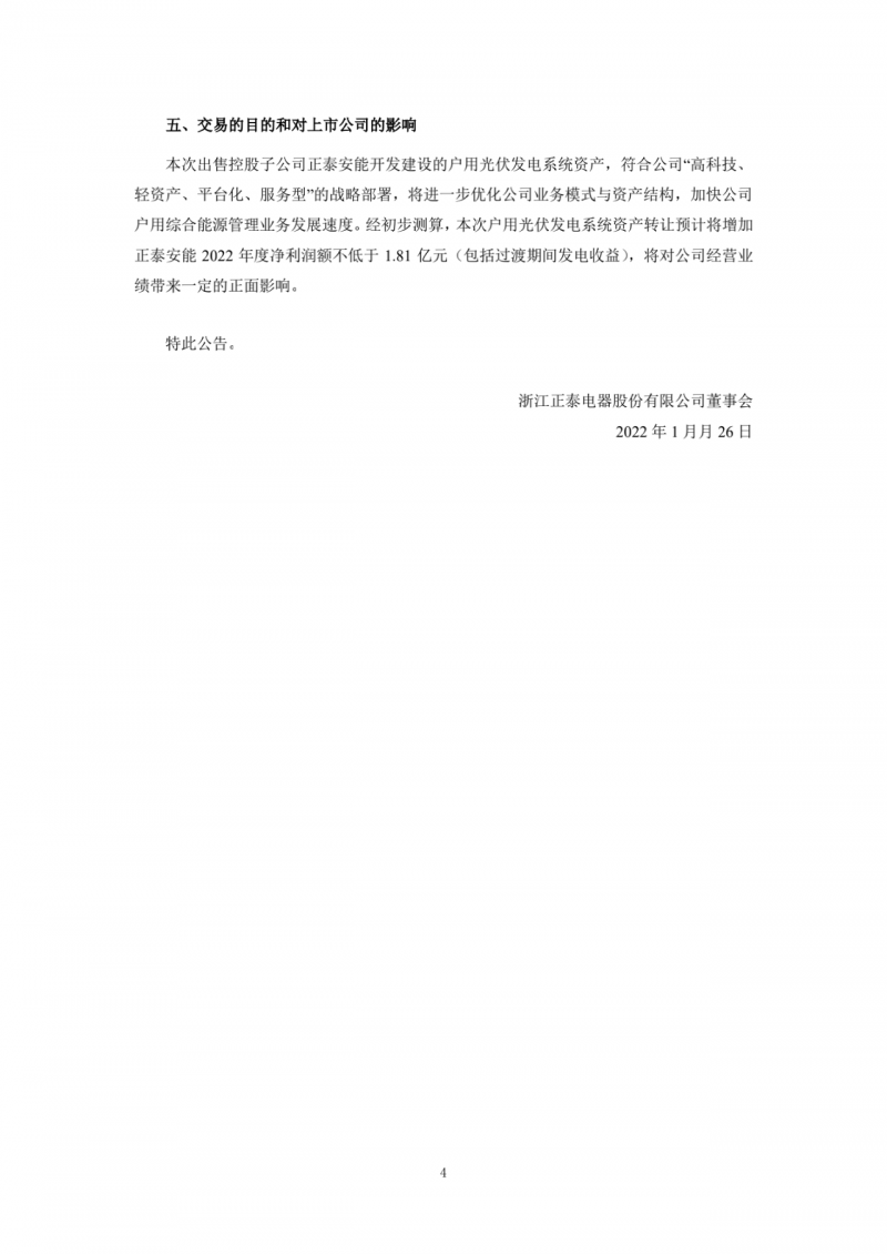 正泰電器認(rèn)為,本次出售控股子公司正泰安能開(kāi)發(fā)建設(shè)的戶(hù)用光伏發(fā)電系統(tǒng)資產(chǎn),符合公司“高科技、輕資產(chǎn)、平臺(tái)化、服務(wù)型”的戰(zhàn)略部署,將進(jìn)一步優(yōu)化公司業(yè)務(wù)模式與資產(chǎn)結(jié)構(gòu),加快公司戶(hù)用綜合能源管理業(yè)務(wù)發(fā)展速度。經(jīng)初步測(cè)算,本次戶(hù)用光伏發(fā)電系統(tǒng)資產(chǎn)轉(zhuǎn)讓預(yù)計(jì)將增加正泰安能2022年度凈利潤(rùn)額不低于1.81億元(包括過(guò)渡期間發(fā)電收益),將對(duì)公司經(jīng)營(yíng)業(yè)績(jī)帶來(lái)一定的正面影響。