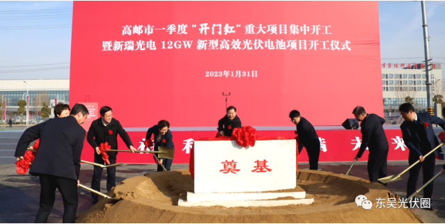 市委書記張利宣布開工,并和出席儀式的領導嘉賓共同為項目培土奠基。據(jù)悉,新瑞光電12GW新型高效光伏電池項目總投資100億元,是高郵經(jīng)開區(qū)有史以來首個百億元項目。該項目占地436畝,設備投資30億元,年產(chǎn)12GW高效TOPCon+HJT光伏電池。