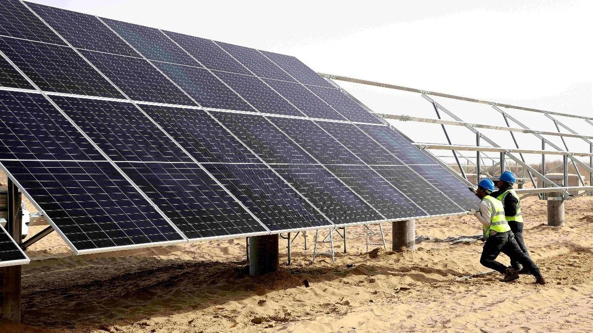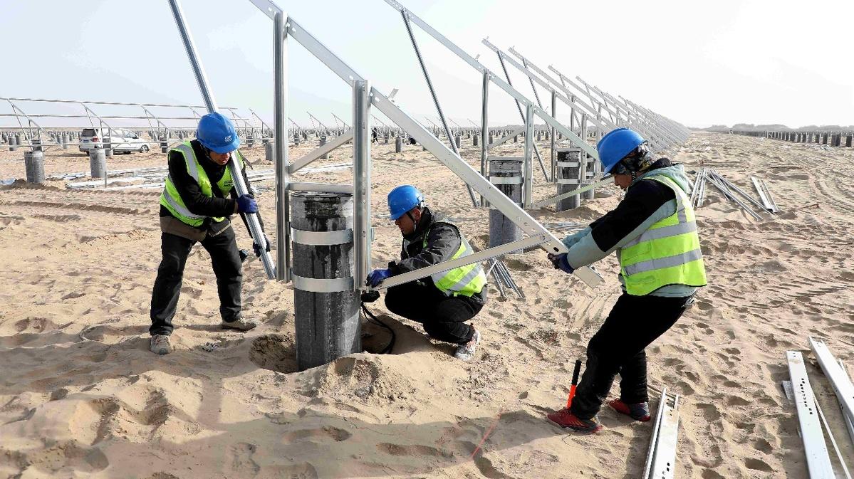 記者在35萬(wàn)千瓦新增負(fù)荷消納光伏發(fā)電項(xiàng)目建設(shè)現(xiàn)場(chǎng)看到,一排排光伏板連線成片,宛如藍(lán)色的海洋,向戈壁深處不斷延伸,呈現(xiàn)出一派蓬勃發(fā)展的新氣象。項(xiàng)目業(yè)主單位和建設(shè)單位全力組織技術(shù)人員和工人,按照一季度項(xiàng)目施工進(jìn)度計(jì)劃,分片區(qū)、分方陣進(jìn)行光伏支架和光伏組件安裝。目前,110個(gè)發(fā)電方陣、67萬(wàn)塊組件以及相關(guān)設(shè)施的施工正有序進(jìn)行中。
