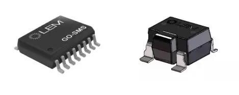 當印刷電路板(Print Circuit Board)上用于電流測量的布板空間比較小時,理想情況是采用芯片式電流測量方案。將初級導(dǎo)體進行集成,直接表面貼裝(Surface Mounted Device)到印刷電路板上,從而降低制造成本,同時也避免混淆各種焊接工藝。LEM 最新開發(fā)的GO-SMS(下圖左)/HMSR-SMS(下圖右) 系列電流傳感器均為SMD封裝的芯片式電流傳感器。
