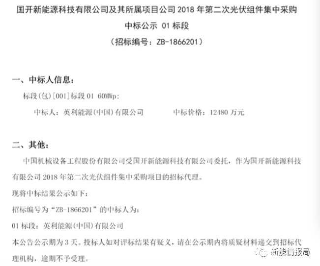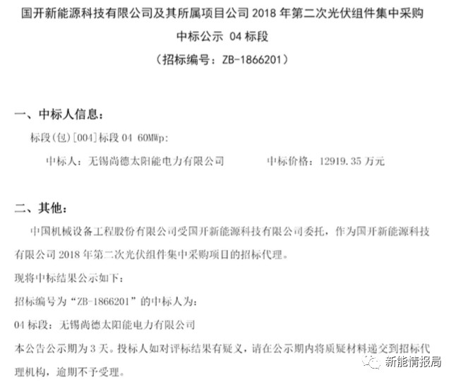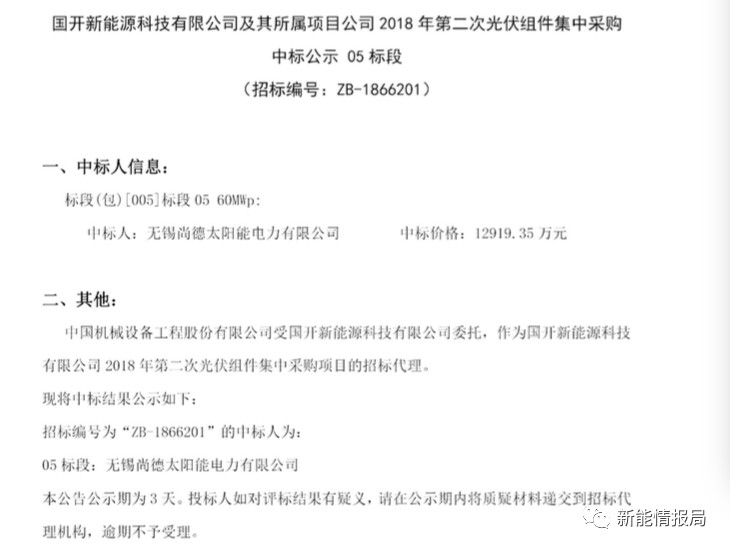 其中,無錫尚德太陽能電力有限公司中標04、05兩個標段,中標價2.584億元。英利能源中標01、02標段,中標價2.505億元,晉能清潔能源中標03標段,中標價1.314億元。