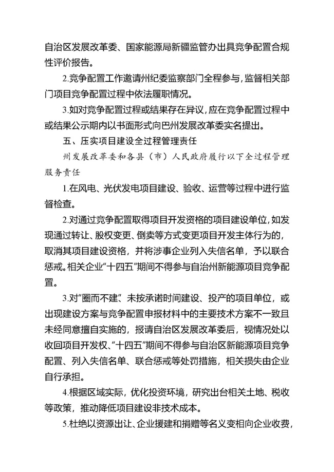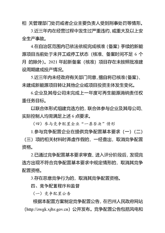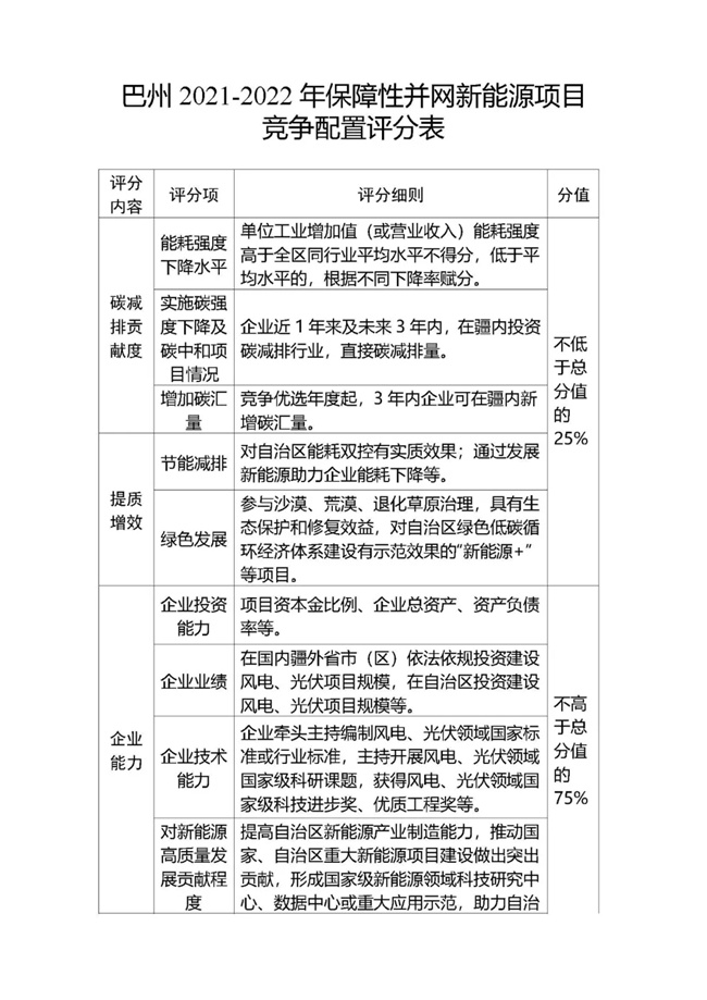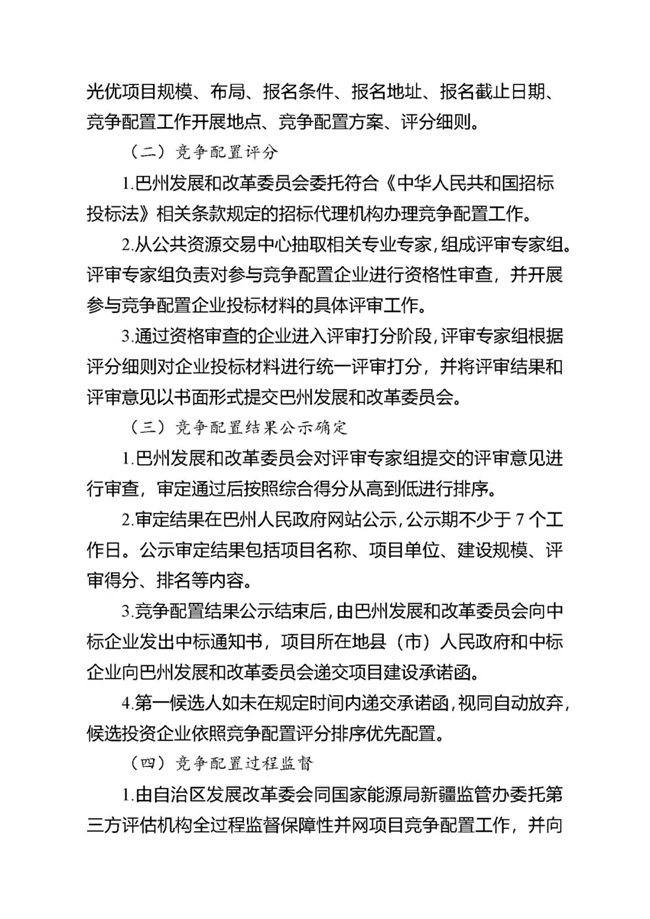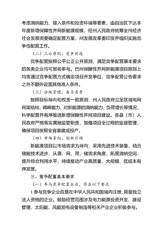 為貫徹落實(shí)碳達(dá)峰、碳中和任務(wù),持續(xù)推動(dòng)巴州風(fēng)電、光伏發(fā)電高質(zhì)量發(fā)展。按照《國家能源局關(guān)于2021年風(fēng)電、光伏發(fā)電開發(fā)建設(shè)有關(guān)事項(xiàng)的通知》(國能發(fā)新能〔2021〕25號(hào)) 《新疆維吾爾自治區(qū)火電和風(fēng)電、光伏等公共資源開發(fā)建設(shè)項(xiàng)目公開招標(biāo)選定業(yè)主暫行辦法》(自治區(qū)人民政府第201號(hào)令)《自治區(qū)發(fā)展改革委國家能源局新疆監(jiān)管辦關(guān)于2021年風(fēng)電、光伏發(fā)電年度開發(fā)建設(shè)方案有關(guān)事項(xiàng)的通知》(新發(fā)改能源〔2021〕419號(hào))等法律法規(guī)文件要求,現(xiàn)將巴州2021-2022年保障性并網(wǎng)新能源項(xiàng)目競(jìng)爭性配置公開優(yōu)選業(yè)主工作公告如下:
