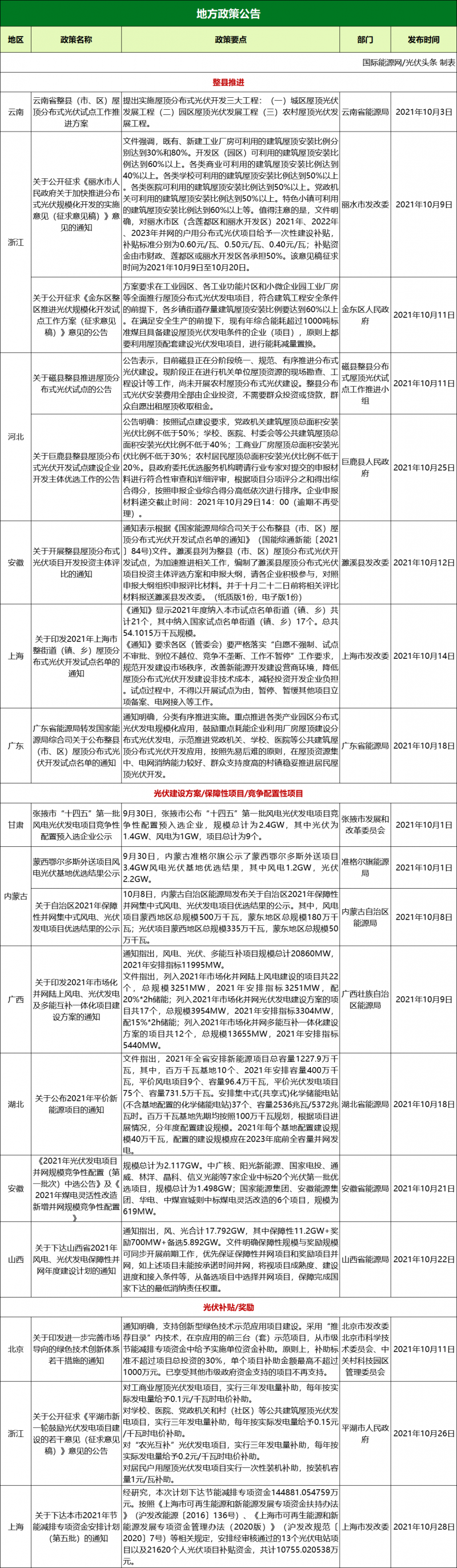 繼在9月國(guó)家能源局公布整縣(市、區(qū))屋頂分布式光伏開發(fā)試點(diǎn)名單的大背景下,10月份云南、浙江麗水市、浙江金華市金東區(qū)、河北磁縣、河北巨鹿縣、安徽濉溪縣、上海、廣東等8地出臺(tái)了整縣推進(jìn)屋頂分布式光伏相關(guān)政策。