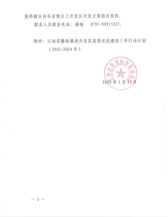 為深入貫徹碳達(dá)峰、碳中和重大戰(zhàn)略決策,加快發(fā)展可再生能源,實(shí)施可再生能源替代行動(dòng),提升我省開(kāi)發(fā)區(qū)能源自供給能力,我委編制了《江西省整體推進(jìn)開(kāi)發(fā)區(qū)屋頂光伏建設(shè)三年行動(dòng)計(jì)劃( 2022-2024年)》,經(jīng)委主任辦公會(huì)審議通過(guò)后印發(fā)給你們,請(qǐng)認(rèn)真貫徹執(zhí)行。各設(shè)區(qū)市發(fā)展改革委(能源局)于3月10日前將轄區(qū)內(nèi)各省級(jí)以上開(kāi)發(fā)區(qū)開(kāi)發(fā)方案報(bào)送我委。
