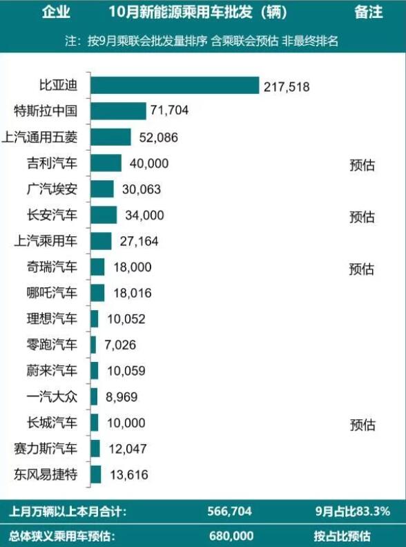 乘聯(lián)會(huì)指出,考慮到主力企業(yè)中的個(gè)別企業(yè)10月減量因素與增量因素的平衡,10月主力企業(yè)占比較上月主力企業(yè)(萬(wàn)輛以上)保持基本穩(wěn)定,因此預(yù)估10月乘聯(lián)會(huì)新能源乘用車廠商批發(fā)銷量68萬(wàn)輛,環(huán)比9月增1%,同比去年10月增長(zhǎng)約87%。