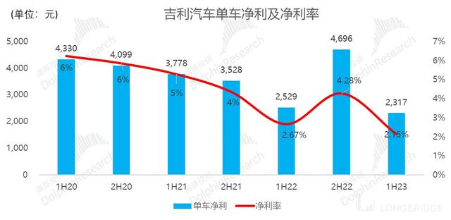 2023 年上半年吉利汽車實(shí)現(xiàn)歸母凈利潤(rùn) 15.7 億元,同比增長(zhǎng)約 1%,略超市場(chǎng)預(yù)期 15.1 億元。但凈利率下滑從 2022 年上半年 2.7% 下滑至 2023 年上半年 2.2%, 單車凈利也從 2529 元降低至 2317 元。
