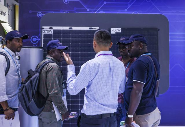 4月15日,參展商在第135屆廣交會上向采購商介紹太陽能電池組件展品。新華社記者劉大偉攝