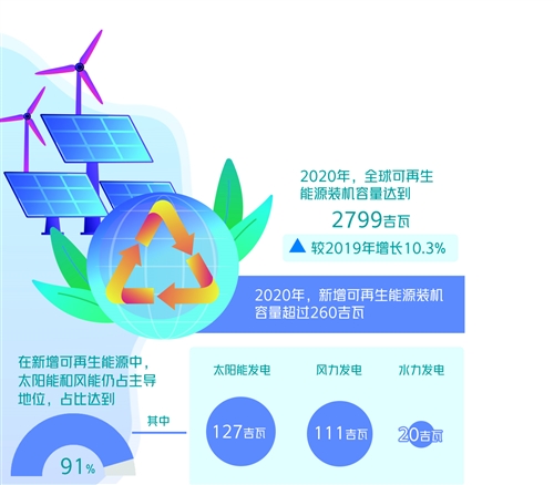 總部位于阿聯(lián)酋首都阿布扎比的國際可再生能源署(IRENA)近日發(fā)布報(bào)告《可再生能源裝機(jī)容量數(shù)據(jù)2021》。報(bào)告稱,2020年,全球可再生能源裝機(jī)容量達(dá)到2799吉瓦,較2019年增長10.3%;新增可再生能源裝機(jī)容量超過260吉瓦。