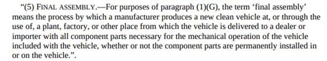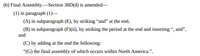 其中之一即下圖中(G)條款,車輛的總裝須發(fā)生在北美地區(qū)之內。