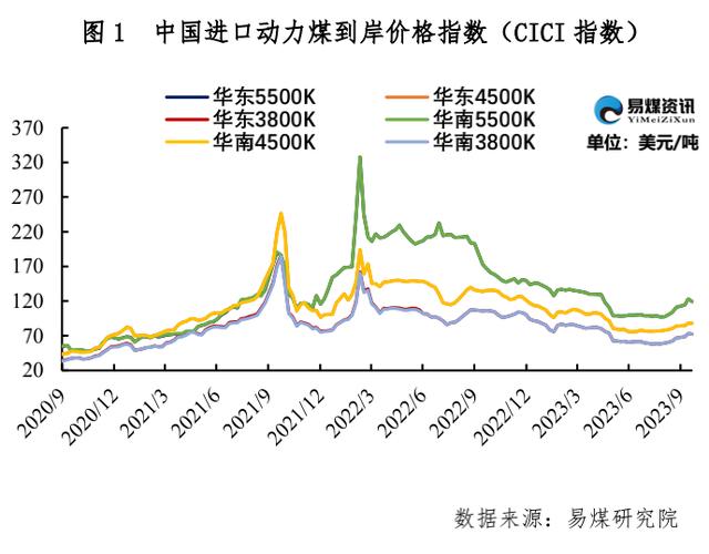 本周進口市場表現(xiàn)一般,電廠采購多以剛需為主,貿(mào)易商出貨意愿提升,投標價格變化不大,中標價格基本維穩(wěn)。就貿(mào)易商而言,受巴以沖突影響,海外能源價格走強,海外煤價相對堅挺,雖然印尼供應(yīng)有所好轉(zhuǎn),但礦方降價意愿依舊不高,所以印尼煤采購成本依舊較高,進口貿(mào)易商報價較為堅挺,但投標積極性提升;就下游終端而言,雖然沿海電廠庫存環(huán)比下滑,但依舊位于歷史高位,隨著氣溫回落,日耗低位震蕩,電廠采購意愿不高,大部分電廠已經(jīng)采購11月底貨物,預(yù)計電廠過冬壓力不大。印尼煤Nar3800K的11月貨盤FOB中標價至大概為62-65美元/噸,澳煤Nar5500K報價回落至104-106美元/噸。