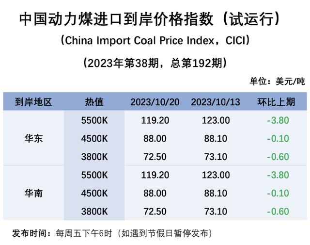 截至10月20日,5500K華東和華南到岸價均為119.20美元/噸,較上期下跌3.80美元/噸,較國內(nèi)煤價低20-25元/噸;4500K華東和華南到岸價均為88.00美元/噸,較上期下跌0.10美元/噸,與國內(nèi)煤價低20-25元/噸;3800K華東和華南到岸價均為72.50美元/噸,較上期下跌0.60美元/噸,較國內(nèi)煤價低10-15元/噸。(理論測算,僅供參考)。