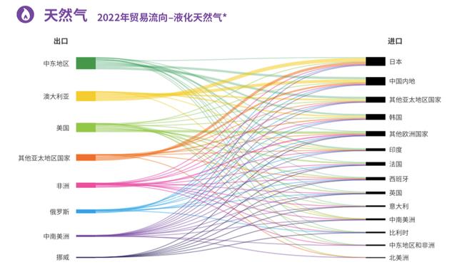 2022年,國際液化天然氣貿(mào)易量占所有地區(qū)間天然氣貿(mào)易量的56%,總量達到5,420億立方米,較上一年增長5%。中東地區(qū)是最大的液化天然氣出口地區(qū),與澳大利亞和美國合計占液化天然氣出口總量的65%。日本是最大的液化天然氣進口國,進口量達980億立方米,與中國合計占全球進口總量的35%。亞太地區(qū)的進口量約占液化天然氣進口總量的65%,歐洲地區(qū)緊隨其后,占比超過30%。