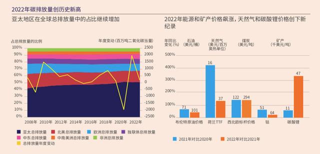 年鑒顯示,2022年,全球一次能源需求增長放緩,整體增速低于2021年;除歐洲與獨聯(lián)體外,所有地區(qū)的一次能源消費量均有增長。其中,石油、煤炭、天然氣三種資源的價格持續(xù)走高。數(shù)據(jù)顯示,全球石油消費量、煤炭需求和產(chǎn)量均有所增長;而天然氣需求下降3%,管道天然氣凈貿(mào)易的總量也同步下滑。同時,可再生能源發(fā)電占比的提升也已成為重要趨勢——2022年,可再生電力(不包括水電)增長14%,滿足了84%的電力需求凈增量。