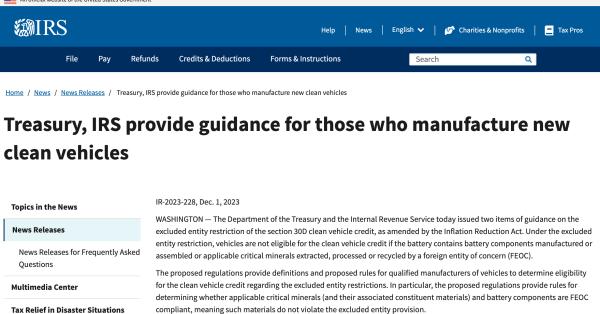 12月1日,美國能源部(DOE)發(fā)布《兩黨基礎(chǔ)設(shè)施法》中 “敏感外國實體(Foreign Entity of Concern,F(xiàn)EOC)”的解釋文件。同日,美國財政部(Treasury)和國稅局(IRS)發(fā)布了《通貨膨脹削減法》(IRA)第30D條清潔能源車輛稅收抵免相關(guān)禁令的指導(dǎo)意見。