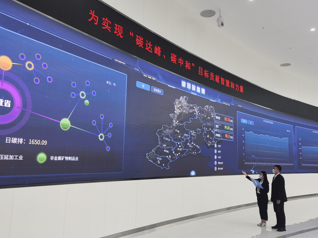 國網(wǎng)河北電力員工通過碳達峰、碳中和監(jiān)測平臺分析主要行業(yè)碳排放情況。