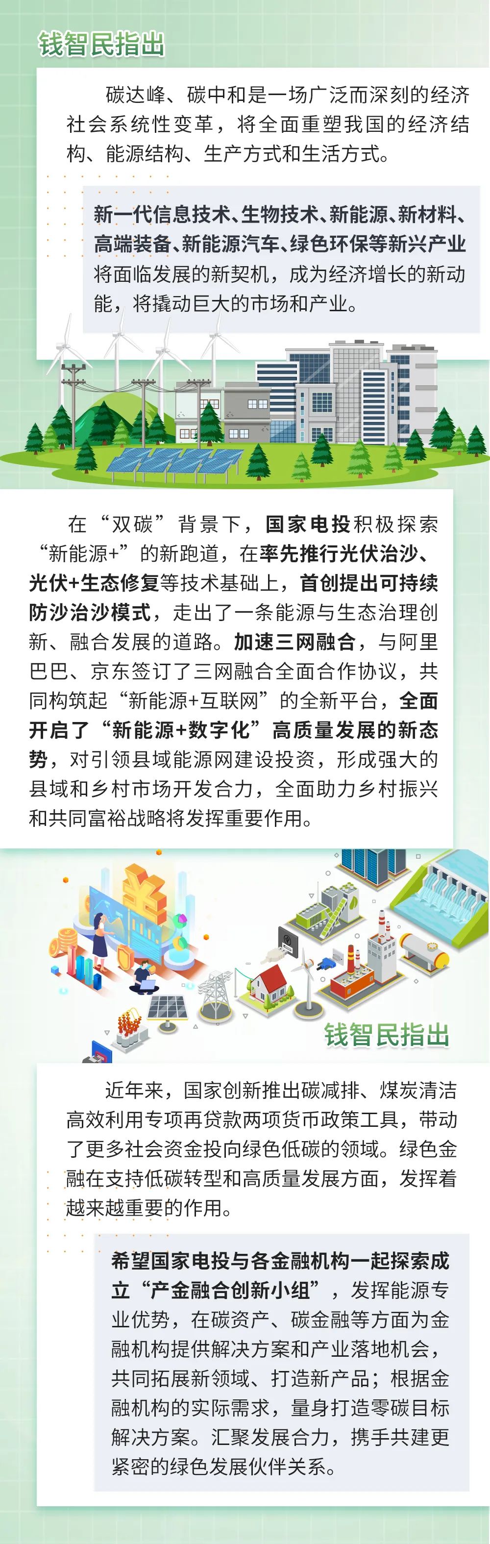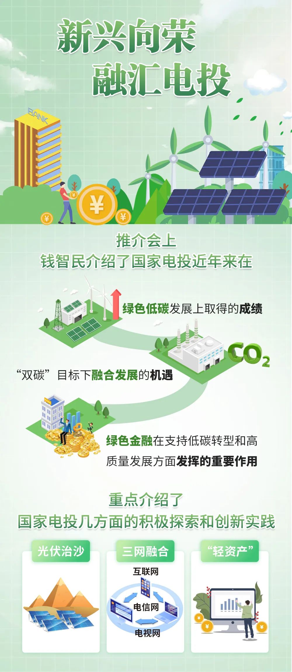 “錢智民介紹道,國家電投作為我國唯一擁有核電、火電、水電、風(fēng)電、光伏發(fā)電、生物質(zhì)發(fā)電等全部發(fā)電類型的能源企業(yè),深入踐行習(xí)近平總書記關(guān)于清潔低碳發(fā)展的重要指示批示精神,以“創(chuàng)造綠色價(jià)值”為使命,以“綠色 創(chuàng)新 融合,真信 真干 真成”為核心價(jià)值觀,制定了面向新時(shí)代的“2035一流戰(zhàn)略”,在綠色低碳發(fā)展上取得了顯著成效。目前,國家電投裝機(jī)總規(guī)模已突破2億千瓦,新能源發(fā)電裝機(jī)量、可再生能源發(fā)電裝機(jī)量、清潔能源發(fā)電裝機(jī)量均居世界第一。他表示,在全球能源結(jié)構(gòu)向非化石能源轉(zhuǎn)型的進(jìn)程中,把握“風(fēng)光無限”的未來機(jī)遇取決于新能源技術(shù)創(chuàng)新,更取決于金融。我們?cè)概c金融企業(yè)共同發(fā)力,為實(shí)現(xiàn)中國能源清潔低碳轉(zhuǎn)型貢獻(xiàn)更大力量。”