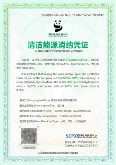 近年來,國網(wǎng)四川省電力公司按照“強(qiáng)電網(wǎng)、快建設(shè)、優(yōu)服務(wù)”工作主線,為包括永祥新能源有限公司在內(nèi)的樂山“中國綠色硅谷”建設(shè)提供了堅強(qiáng)的電力要素保障。此次清潔能源消納憑證的頒發(fā),更讓硅谷“綠色”有據(jù)可依,有跡可循。 “2022年上半年,企業(yè)用電量接近30億千瓦時,其中水電、風(fēng)電、太陽能發(fā)電生產(chǎn)的清潔電力占比100%,這次頒發(fā)的清潔能源消納憑證,完整展示了企業(yè)消費(fèi)清潔電力的全過程信息,也支持二維碼溯源查詢。”四川永祥股份有限公司電力總監(jiān)張鋅稱。8月起,凡是參與到四川省電力市場化交易的企業(yè)均可在四川電力交易平臺申請領(lǐng)取清潔能源消納憑證,四川電力交易中心將按照相關(guān)規(guī)定,給符合申請要求的企業(yè)發(fā)放該憑證為企業(yè)綠色低碳發(fā)展保駕護(hù)航,為國家“雙碳”目標(biāo)實現(xiàn)注入新活力。