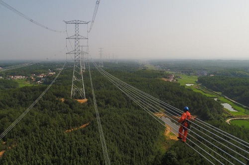 國網(wǎng)陜西電力員工在南陽—荊門—長(zhǎng)沙1000千伏特高壓工程線路安裝間隔棒。