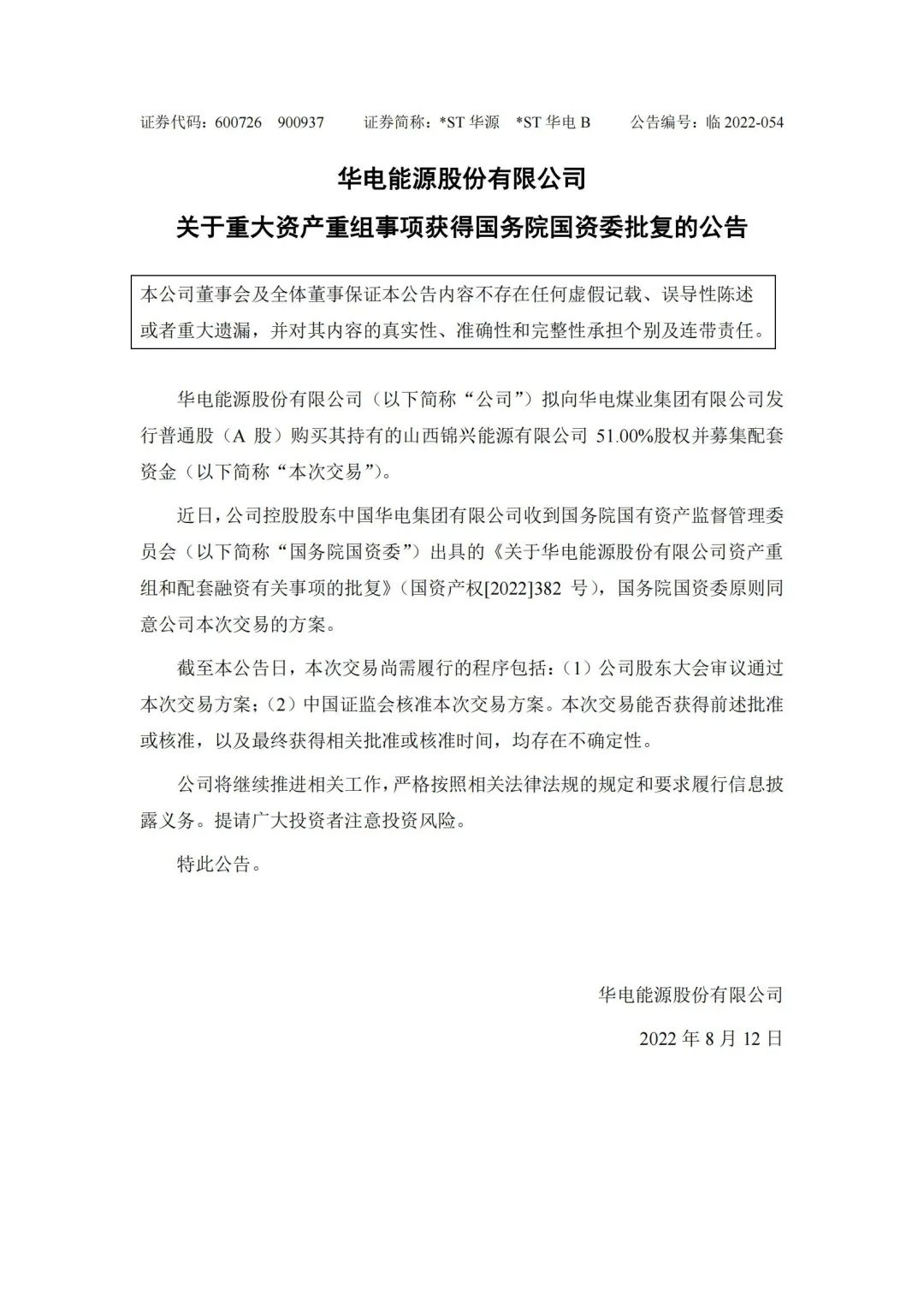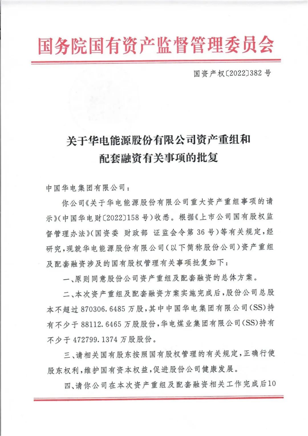 華電能源也發(fā)布公告,確認(rèn)重大資產(chǎn)重組事項獲得國務(wù)院國資委批復(fù)。