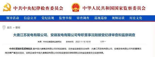 大唐江蘇發(fā)電、安徽發(fā)電專職董事涉嫌嚴重違紀違法被查